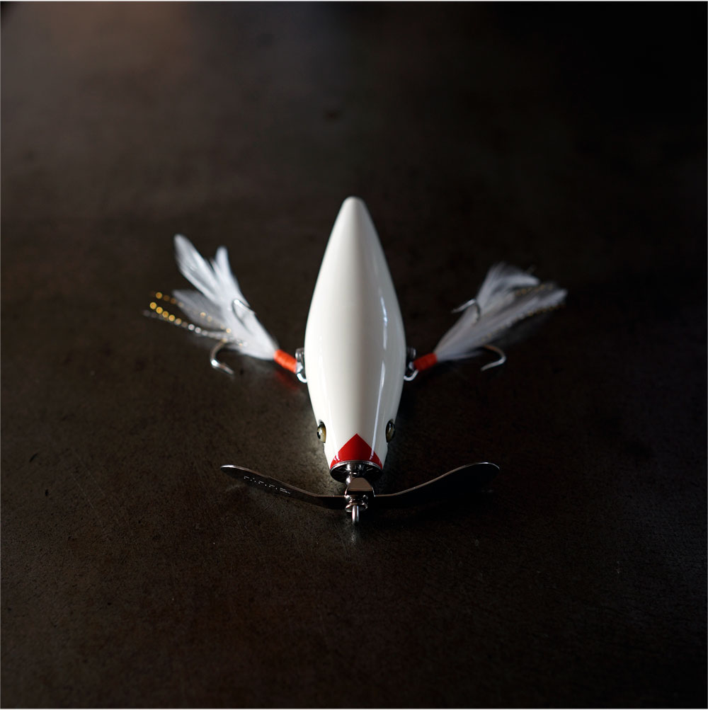 This is the second anniversary model of the wooden lure with a built-in rattle, the Trough. This model creates metallic sounds and slight vibrations due to the interference between the big propeller and the front part. The vibrations amplify the sound of the built-in rattle, creating a unique sound. This is a mysterious lure that has a strong appeal with a weak movement. The wriggling dot action that is unique to the big propeller plug on the front is still alive and well. It is a plug that appeals to the five senses of fish, attracting them with dots on the shore and with a unique sound when retrieved.
